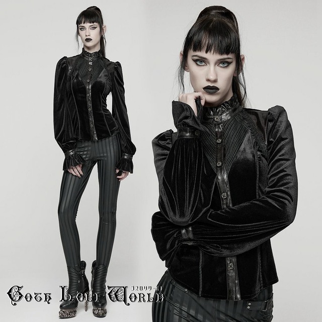 【即納/送料無料】ゴスロリワールド WY-1819CCF-BK ゴシック ファッション 光沢ベロア 長袖シャツ ブラウス 黒色 ゴシック ゴスロリ ビジュアル系 ヴィジュアル系 V系 地雷系