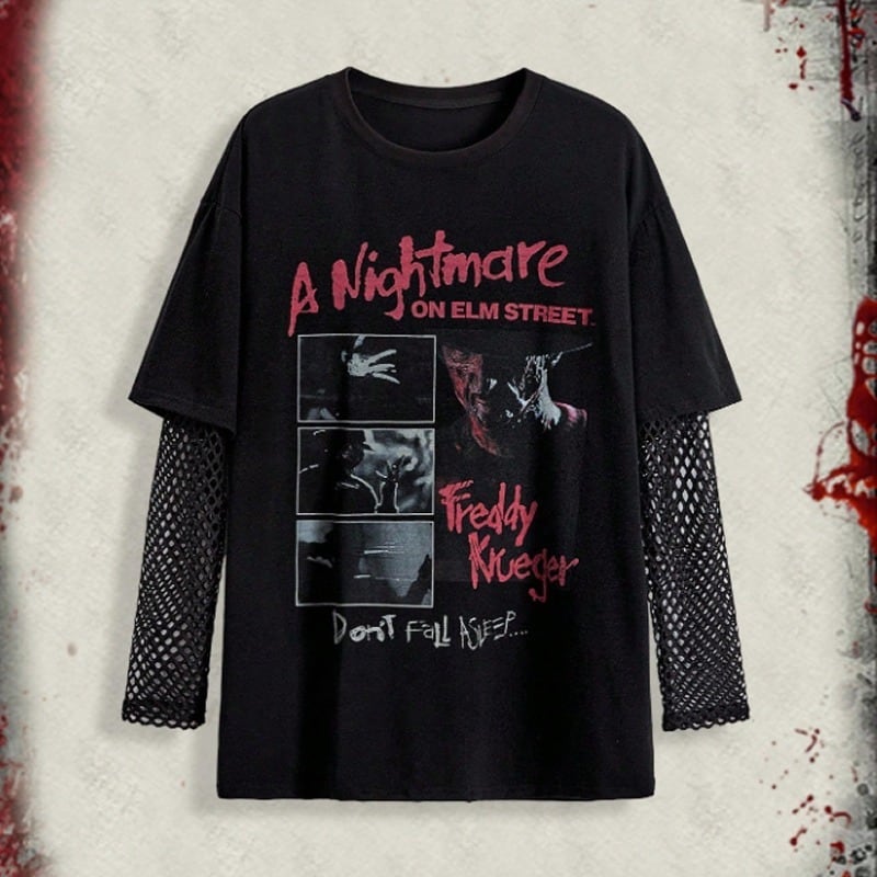 【即納/送料無料】当日発送 即納 GLW-015 パンク ロック ホラー A Nightmare on Elm Street プリント メッシュパネル ルーズ Tシャツ カットソー トップス レディース 原宿 原宿系
