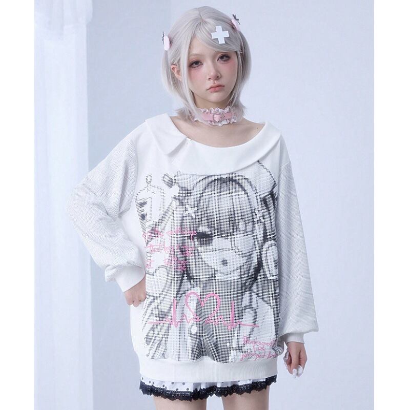 【即納/送料無料】当日発送 即納 GLW-016 Kawaii かわいいアニメ調 ピーターパン襟 オブリークショルダー レディーススウェットシャツ カットソー トップス 原宿系 病みかわいい