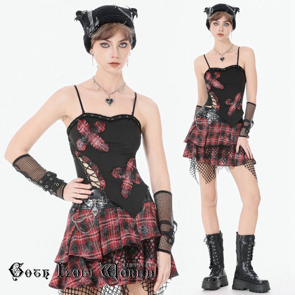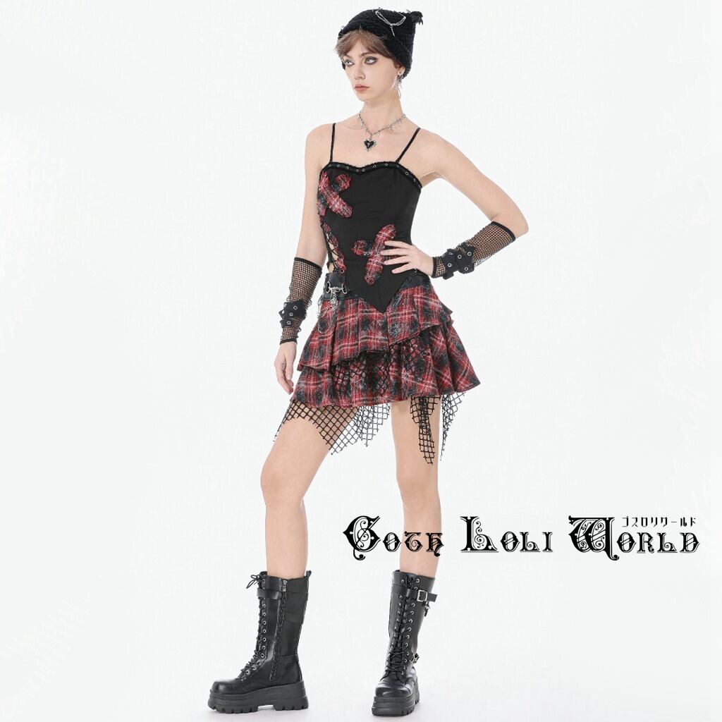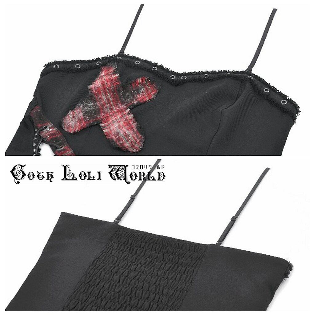 【即納/送料無料】ゴスロリワールド TW676 ゴシック ファッション レースアップ チェック柄クロス シャーリング キャミソール 地雷系 ゴスロリ パンク 個性的 ビジュアル系 V系
