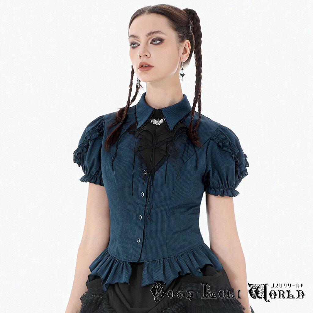 【即納/送料無料】ゴスロリワールド IW143 ロリータ ファッション ボウタイジャボ付 ダブルフリル半袖 シャツ ブラウス ブルー色 ゴスロリ ロリィタ 地雷系 ライブ衣装 舞台衣装