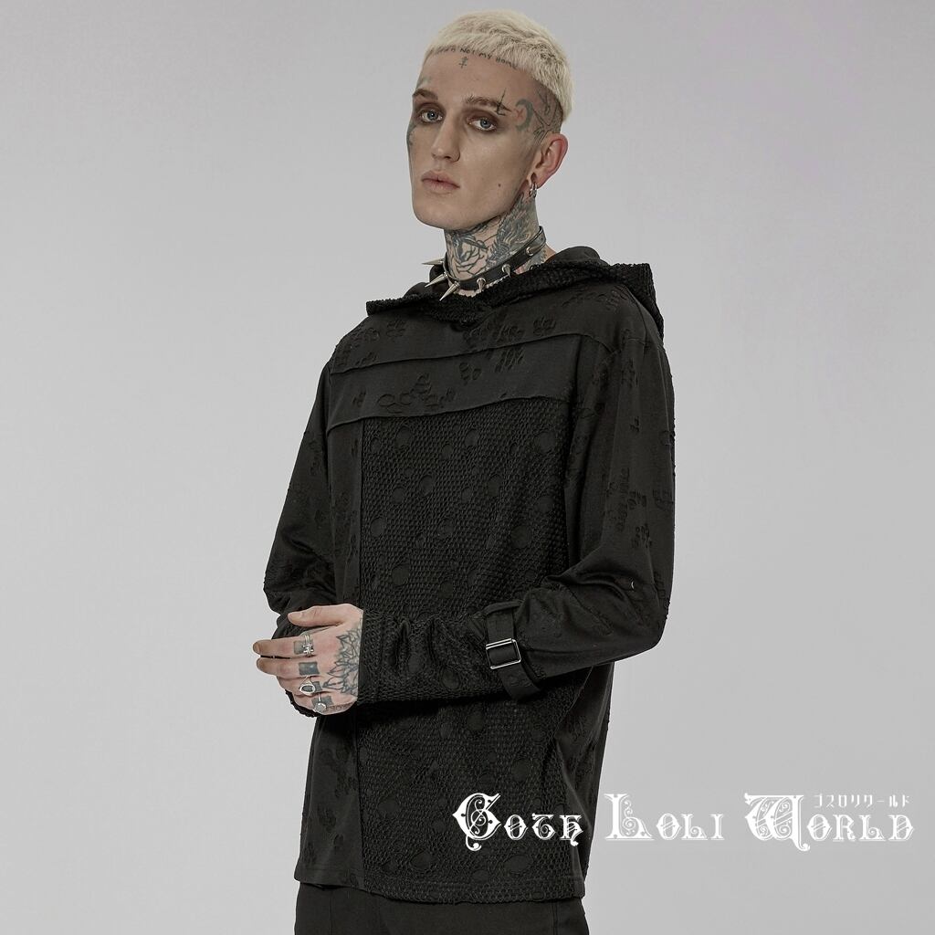 【即納/送料無料】ゴスロリワールド WT-738TCM-BK パンク ロック ファッション メッシュ ダメージ風フード付 カットソー パーカー メンズ ゴシック V系 モード系 個性的