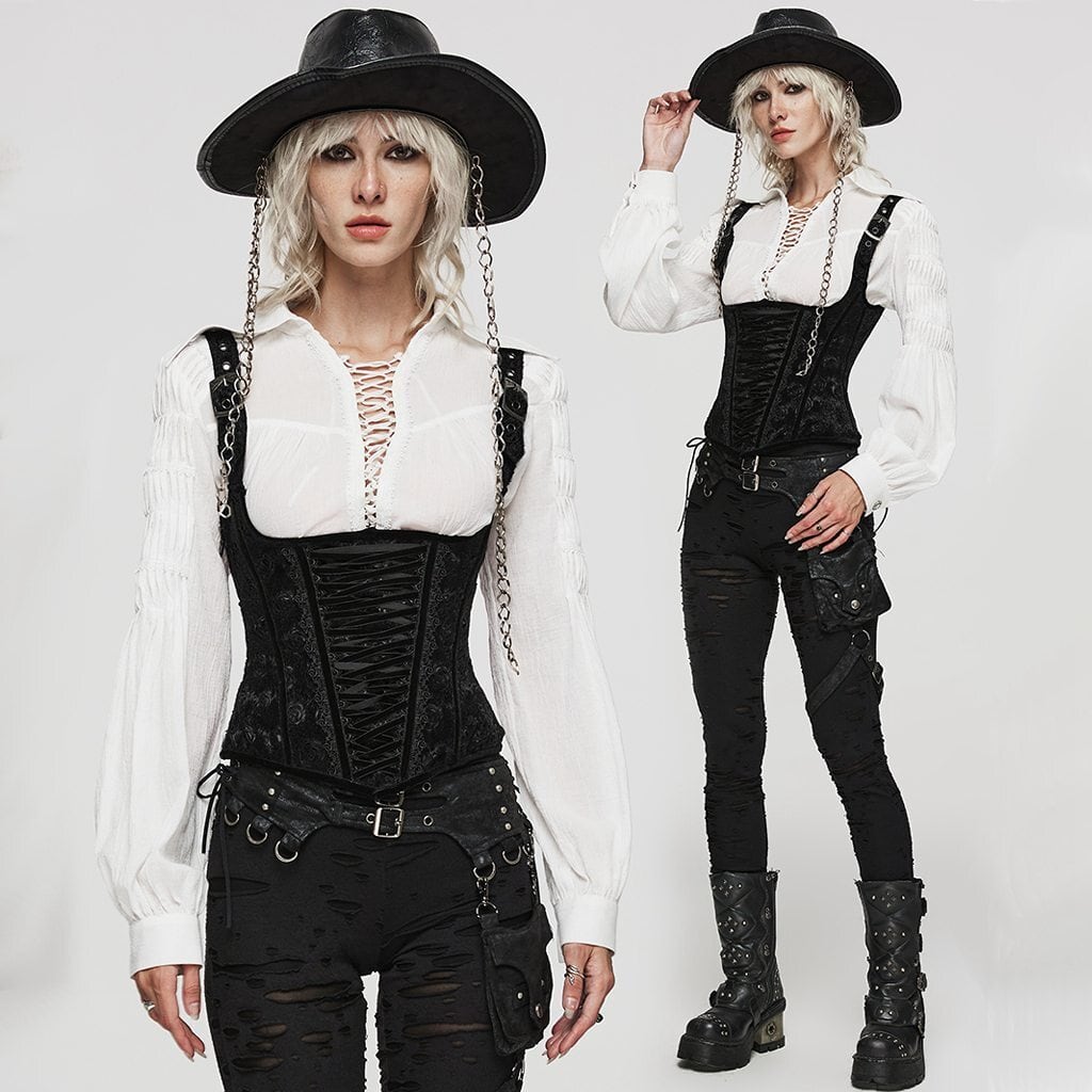 WS-569YDF-BK ジャガードローズファーベルトストラップ コルセット ブラック ファッション ゴシック ゴスロリ パンク ロック スチームパンク ビジュアル系 ヴィジュアル系 V系 モード系 地雷系 サブカル コスプレ ライブ ステージ 舞台 仮装 SM サイバー ハロウィン 衣装