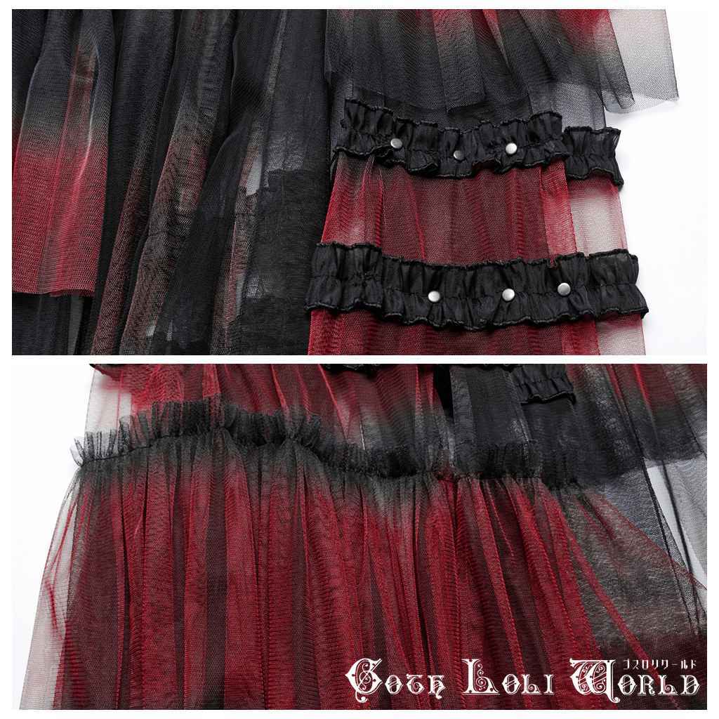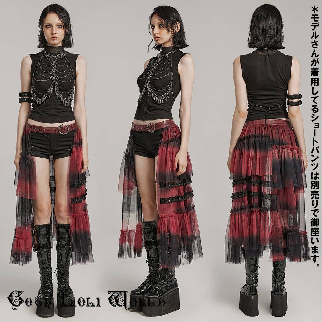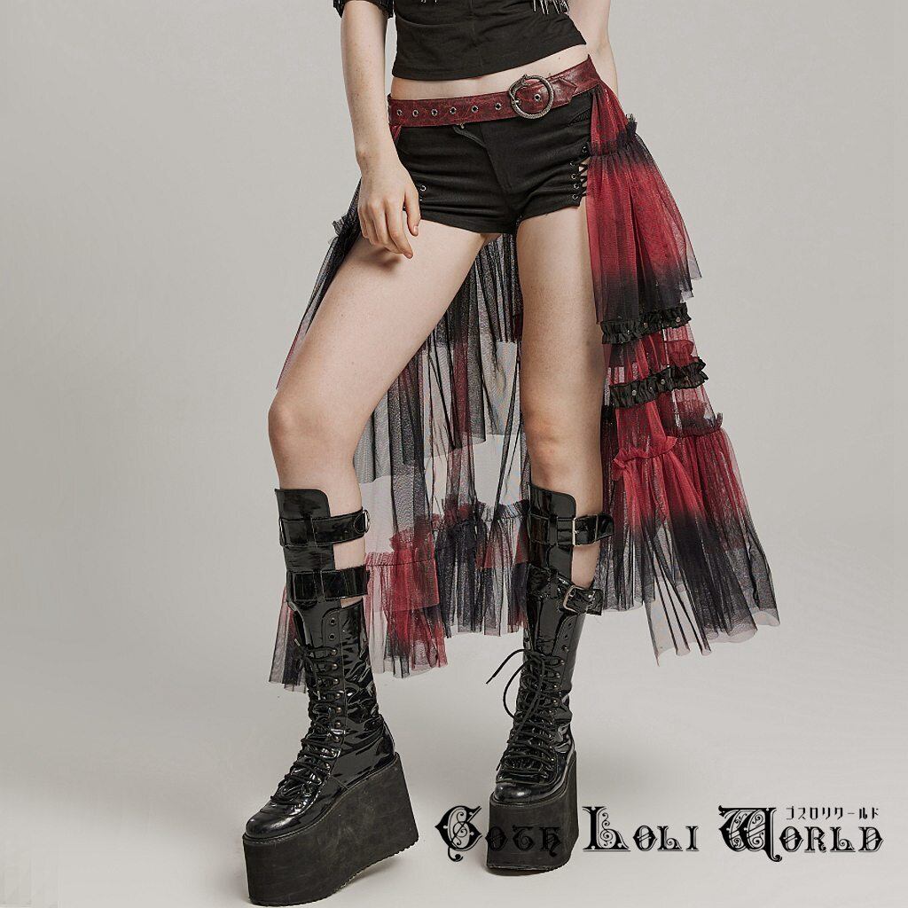 【即納/送料無料】WQ-704BQF-BK-RD ベルト留めアシンメトリーティアードチュール カバースカート 赤色 ファッション ゴシック ゴスロリ パンク ロック ロリィタ ビジュアル系 V系 モード系 地雷系 | ゴスロリワールド
