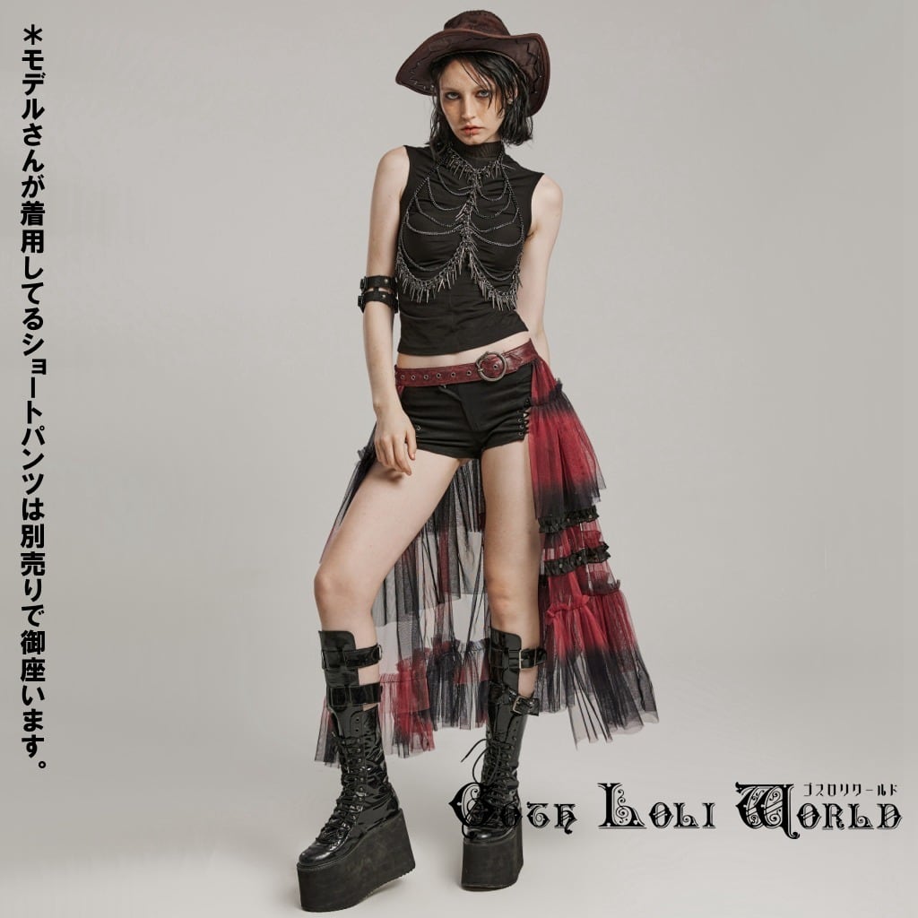 WQ-704BQF-BK-RD ベルト留めアシンメトリーティアードチュール カバースカート 赤色 ファッション ゴシック ゴスロリ パンク ロック スチームパンク ビジュアル系 ヴィジュアル系 V系 モード系 地雷系 サブカル コスプレ ライブ ステージ 舞台 仮装 SM サイバー ハロウィン 衣装