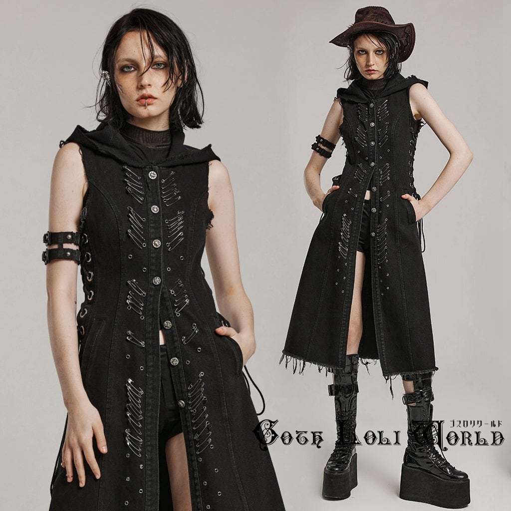 WY-1574MJF-BK フード付きブロークン連続クリップロング ベストジレ ジャケット ファッション ゴシック ゴスロリ パンク ロック スチームパンク ビジュアル系 ヴィジュアル系 V系 モード系 地雷系 サブカル コスプレ ライブ ステージ 舞台 仮装 SM サイバー ハロウィン 衣装