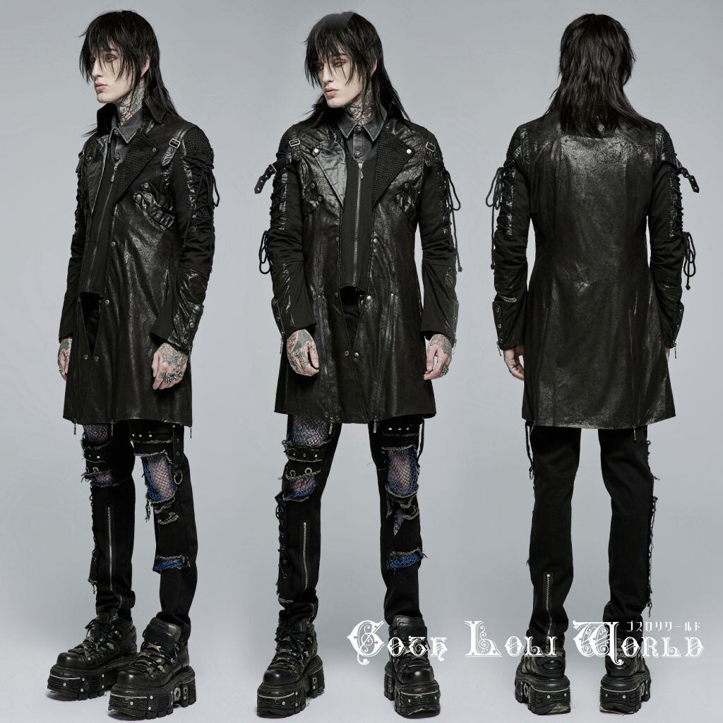 【即納/送料無料】Y-349M-BK アシンメトリーカラーレースアップミドルコート 黒色 メンズ ファッション ゴシック ゴスロリ パンク ロック ロリィタ ビジュアル系 V系 モード系 地雷系 | ゴスロリワールド