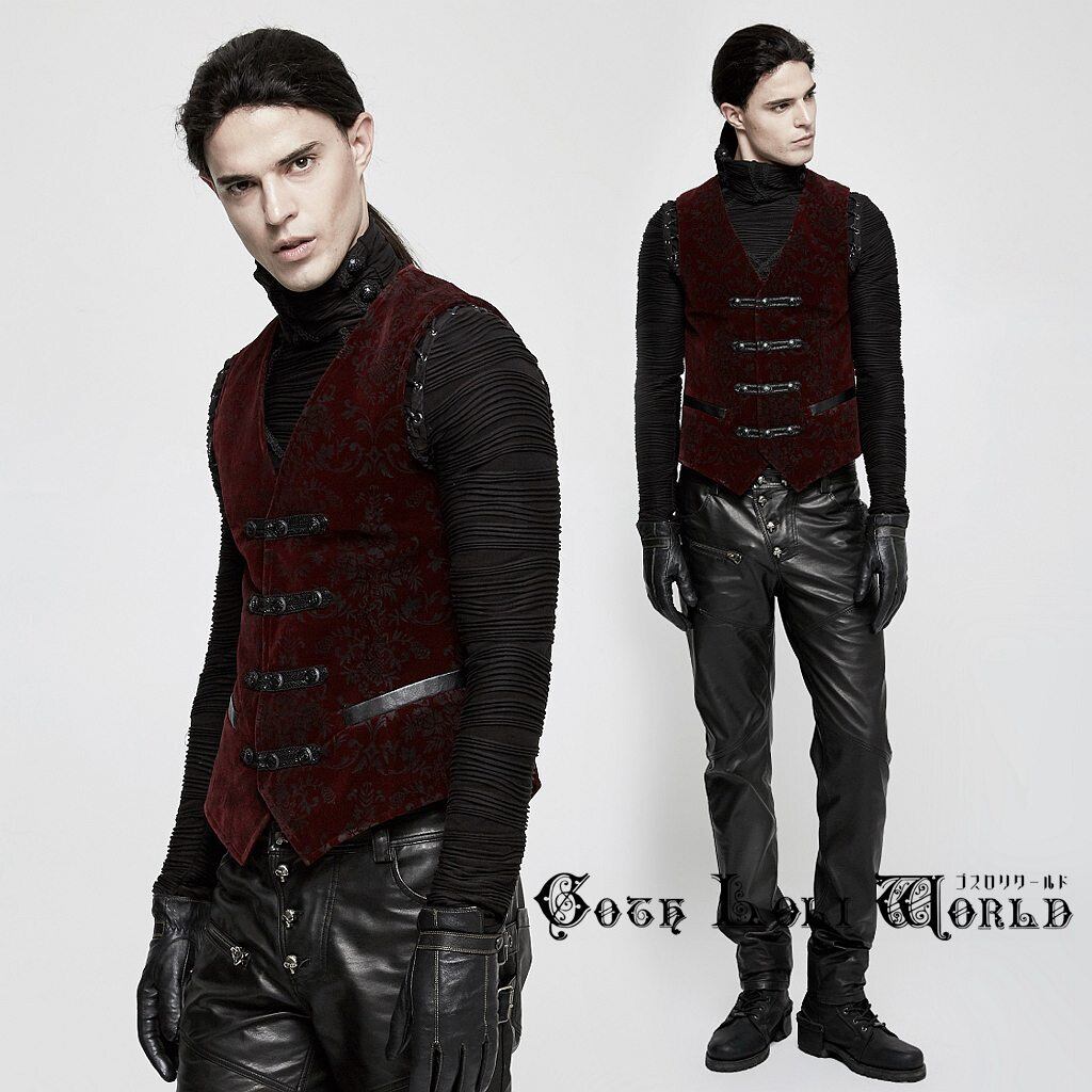 【即納/送料無料】 Y-813-RD ダマスク柄プリントベロア素材カラー ジレ ベスト ワインレッド色 ファッション ゴシック ゴスロリ パンク ロック ロリィタ ビジュアル系 V系 モード系 地雷系 | ゴスロリワールド